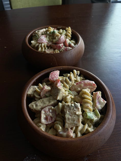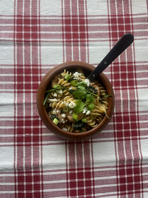 It all started when I texted her a picture of a meal I had made from pantry and freezer staples. She had just house-sat for me while I was away in South Florida paddle board racing (where I won first place in both events). I’d stocked up my fridge and pantry before leaving, including chickpea flour pasta I was curious to see her use. She didn’t—so I experimented with it myself.