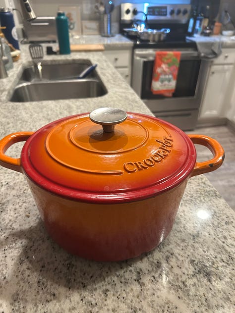 While I didn’t snag my pressure cooker secondhand, I did score some treasures at the thrift store: a retro Crockpot Dutch oven that feels straight out of the ’70s, a fresh set of dinnerware, glass food storage containers, and—because why not—a hula mug.